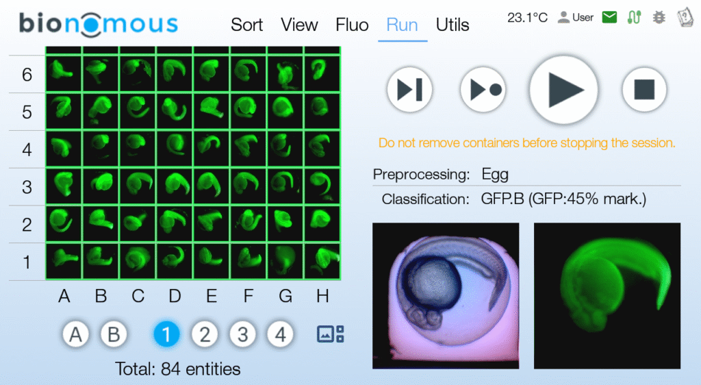 Our goal was to robotize the sorting of the fish eggs to improve our productivity. We acknowledge the perseverance of Bionomous to solve technical difficulties and successfully deliver the tool adapted to our specific needs. The eggsorter dedicated to Medaka fish eggs facilitates the work of our technicians.